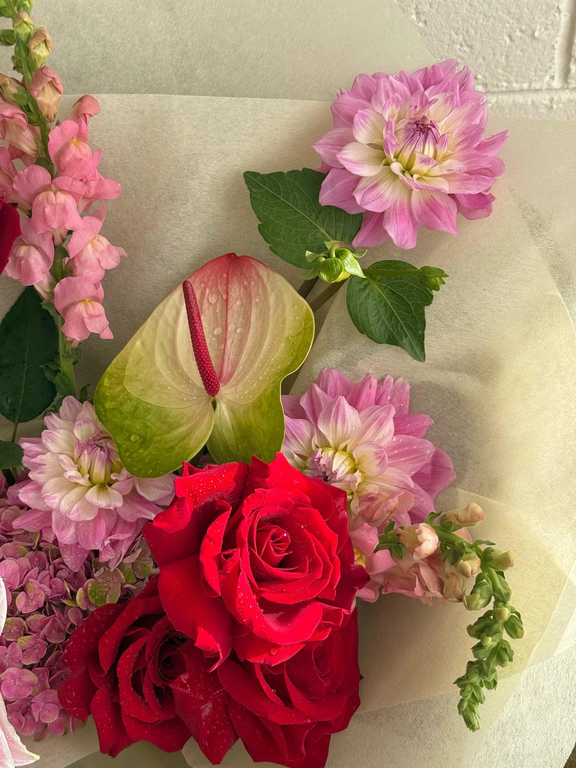 Pink & red seasonal blooms and fresh roses lovingly arranged and gift wrapped.